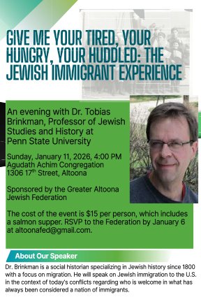 On Sunday, January 11, 2026, at 4 pm, the Greater Altoona Jewish Federation, Agudath Achim Congregation and Temple Beth Israel are pleased to present Dr. Tobias Brinkmann, who will speak about Jewish Immigration to the United States. Dr. Brinkmann is a professor of Jewish Studies and History at The Pennsylvania State University.