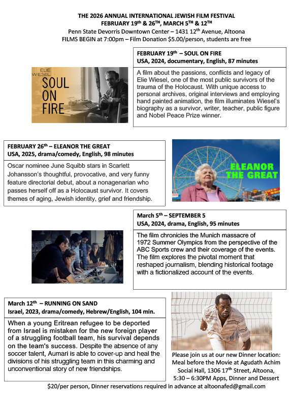 Appetizers and Dinner 5:30 to 6:30 pm at our NEW LOCATON, the Agudath Achim Social Hall followed by the movie at 7:00 pm at the PSU Altoona Devorris Downtown Center. The before movie meal is $20 and the movie is $5.